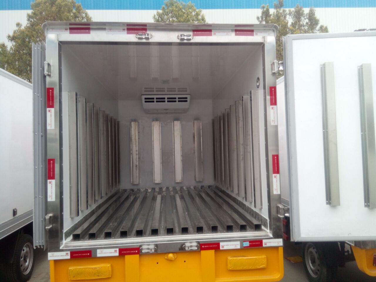 程力晶龍冷藏車廂板材質:內外壁板選用國內優質的機制2.2mm玻璃鋼;中間保溫材料選用厚進口聚氨酯; 廂體厚度80mm 門厚度80mm;底板上面整體鋁花紋板,下面彩鋼板,中間進口聚氨酯;廂體周邊2.5mm鋁合金包邊,不銹鋼包角,不銹鋼門鎖,防碰膠皮4塊,不銹鋼門框, 不銹鋼合頁,箱內節能照明燈。