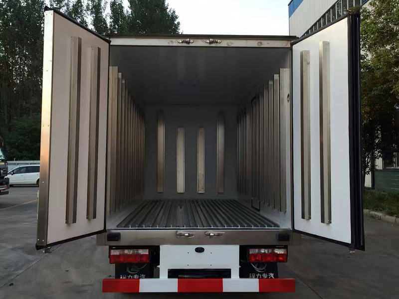 冷藏箱體尺寸長×寬×高為:4000X1880X1850,12.48立方,廂體厚度為8厘米。內(nèi)外板材采用冷藏車專用玻璃鋼,(可反射陽光),中間夾層為聚氨酯發(fā)泡隔熱材料,(防火阻燃隔熱)大型千噸壓力機壓制而成,配置箱體全為不銹鋼鎖件,不銹鋼包角,不銹鋼門框,帶有頂燈及防撞塊。我廠的冷藏保溫車保溫材料選用進口級別XPS,吸水率≤1,導(dǎo)熱系數(shù)≤0.028W/mk,抗壓≥150Kpa,密度30~45kg/m3,使用國際上最為先進的第五代全封閉聚氨酯板塊粘接結(jié)構(gòu),廂板表面材料有玻璃鋼、不銹鋼、鋁合金、彩鋼板等材料可供選擇,廂體成型后具有質(zhì)量輕,保溫系數(shù)高,抗沖擊力強,無滲漏等優(yōu)點,對大氣、水和酸、堿、鹽等介質(zhì)具有良好的耐腐蝕性和抗老化性。通過優(yōu)化設(shè)計,降低了整車質(zhì)心,增大了有效容積。經(jīng)測試,整車綜合節(jié)能率,使用壽命,比一般冷藏保溫廂高1~2倍。
