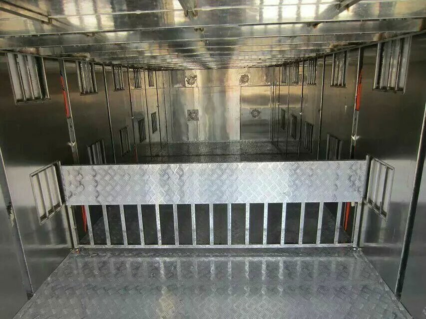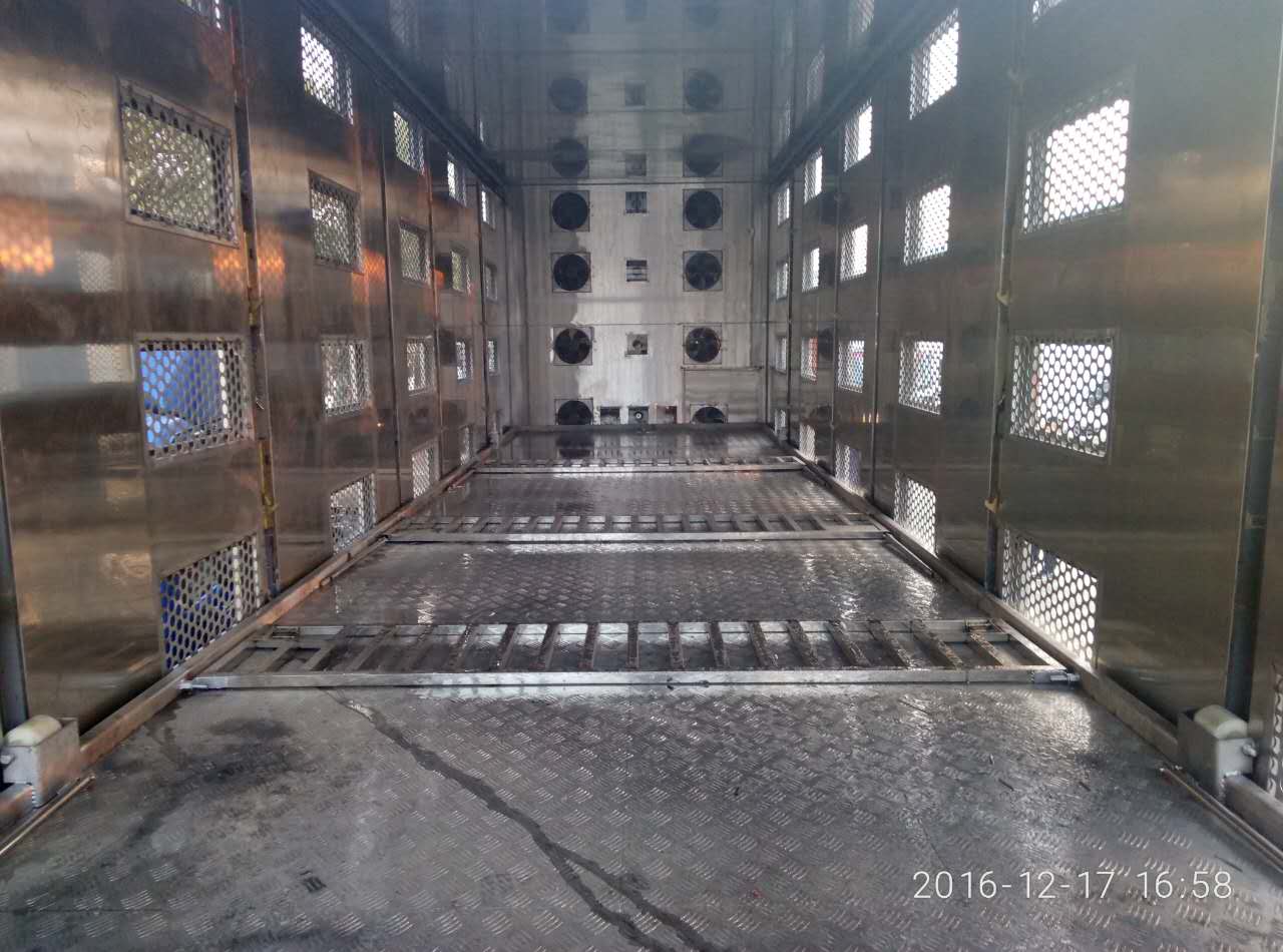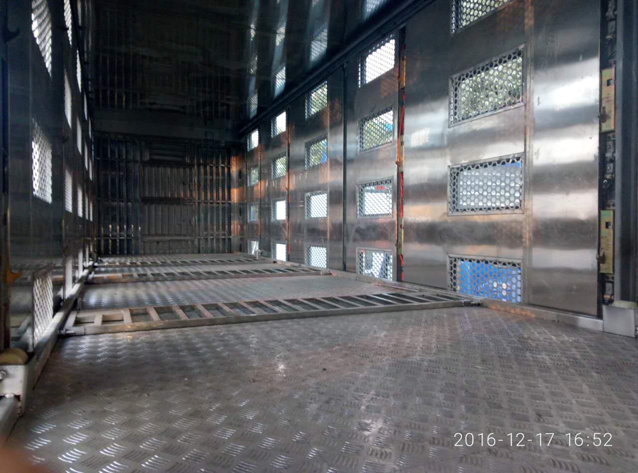 2.車廂內部采用全液壓可調整分層結構,共分3層,每層都是不繡鋼鋼架和底板結構,都能承重300頭以上仔豬的重量,每層4條液壓缸支撐,并配備相應的鎖死結構!