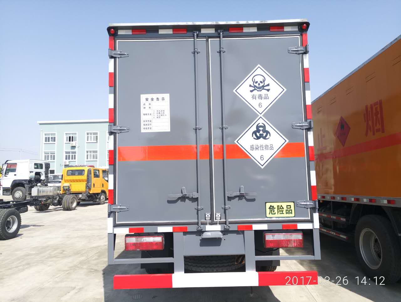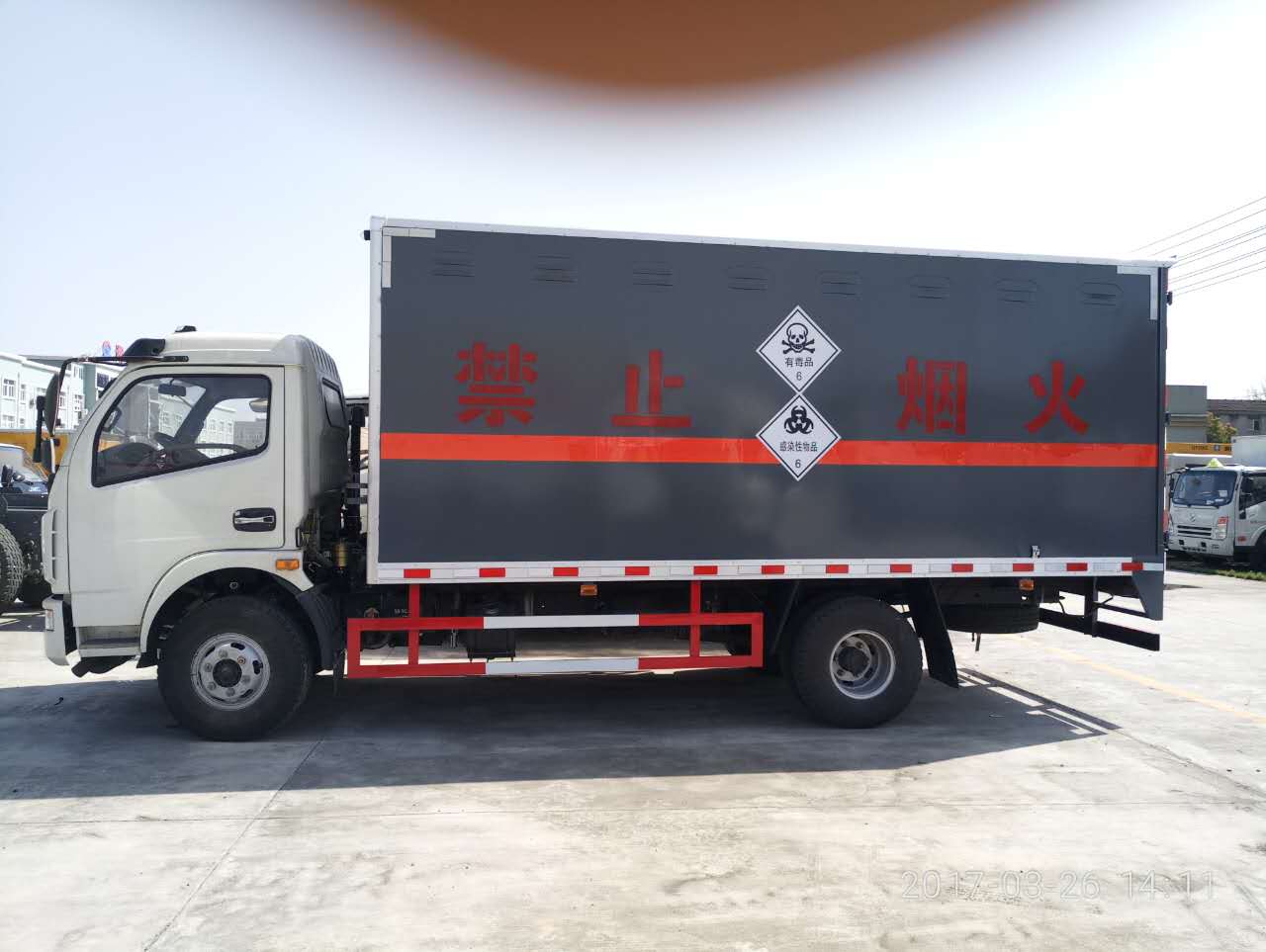 廂體頂部封閉,不可開啟.運輸具有獨立容器(瓶)包裝的介質:砷,苯酚,二甲基苯胺,苯胺,鄰甲苯胺,丙烯醛,烯丙醇,甲基氯(醚),氯化鋇(銅,鉀,鈉),氧化汞,二氧化磷,農藥等,運輸介質類別和項別號:6.1,6.2.僅選用前盤制動器和安裝ABS,限速裝置, 子午線輪胎輪胎的底盤。僅選用排氣管前置的底盤.安裝帶衛星定位裝置的行駛記錄儀,限速80km/h。側、后防護采用碳鋼/Q235B,螺栓加焊接連接,后防護截面高度100mm, 截面寬度50mm,下邊緣離地高度550mm。廂體顏色可變化,選裝側門結構。隨底盤選裝駕駛室.僅選用3800軸距底盤.ABS型號為3631010-C2000,生產廠家為東科克諾爾商用車制動系統(十堰)有限公司.