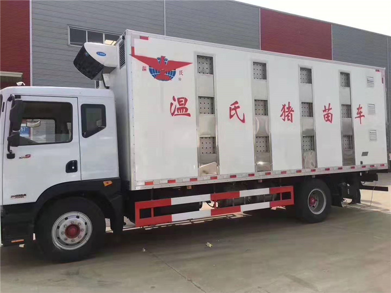 東風多利卡6米8豬苗運輸車配置參數 箱體為全不銹鋼保溫結構,外部部分玻璃鋼飾板;