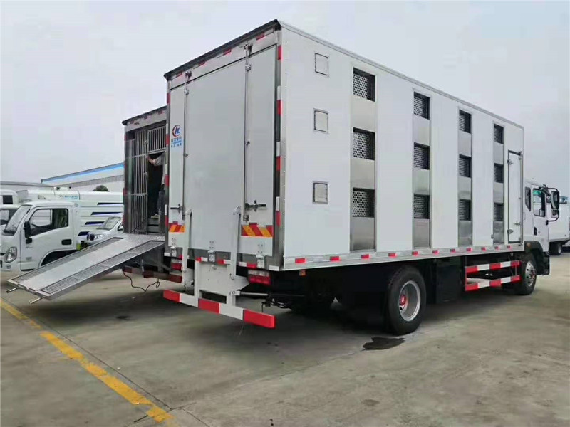 東風多利卡國六6米6仔豬運輸車整車技術參數 東風多利卡排半可前翻駕駛室,東風康明斯國六210馬力柴油發動機,8檔變速箱,斷氣剎,駕駛室帶原廠空調,方向助力,ABS,電動玻璃,中控門鎖,遙控鑰匙,10.00R20鋼絲胎,8噸后橋,可調節大燈,剎車自動調整臂。 箱體為全不銹鋼保溫結構,外部部分玻璃鋼飾板;1,分層裝載機構:箱體內標配2層分層裝載機構,通過液壓系統,實現隔板的升降,每層隔板配置分欄隔斷。 | |||