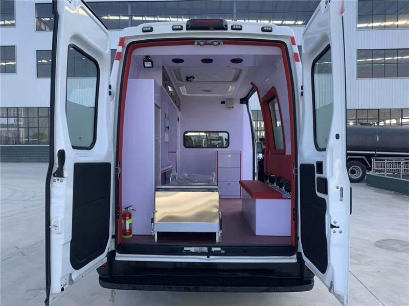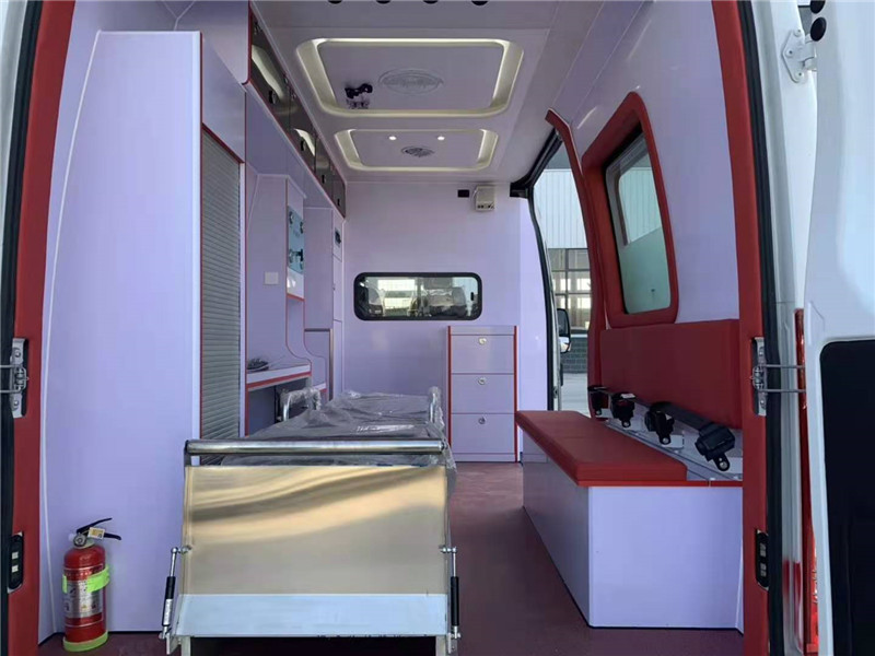 車底、側壁等加強預埋件1,全車隔熱、隔音材料1,車內地板采用進口耐酸、堿、防火、防滑、防靜電地板1,駕駛室與醫療艙安裝異型分隔墻(含一體式鋼化玻璃推拉窗)1,前后對講機1,車頂排風扇1,醫療艙隔墻后折疊醫生看護座椅1,表面覆紅色或藍色皮革1,醫療艙左側藥品、器械儲物柜1,醫療艙左側吊柜1,隔墻后急救箱儲存柜(根據艙內長度選擇)1,醫療艙左側卷簾門儲物柜1,左側安裝10L鋁制氧氣瓶及方便拆卸固定架2,氧氣流量及壓力閥2,氧氣終端2,終端濕化瓶1,醫療艙內右側安裝有安全帶的三人PVC材料柜式床,座墊及靠背表面用皮革包覆1,醫療艙內頂部滑動輸液瓶架1,頂部黃色安全扶手1,醫療艙安裝(國產)自動上車擔架1,上車擔架不銹鋼板導板1,后門左內側安裝鏟式擔架(或在柜式床內存放)1,不銹鋼污物桶1,醫療艙中門、尾門防撞頭靠1,滅火器,醫療艙左側黑色玻璃膜1,右側2/3磨砂膜1,車身腰部紅色/藍色強效反光帶。