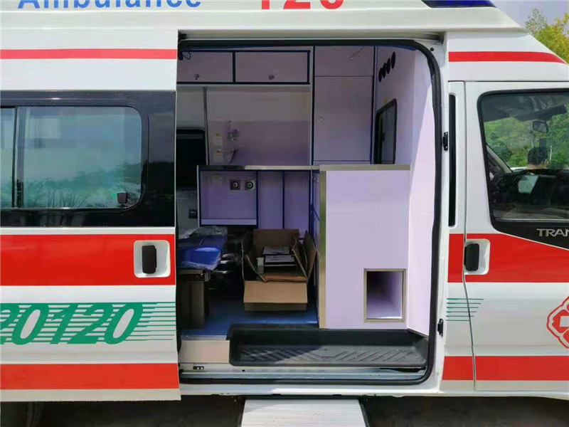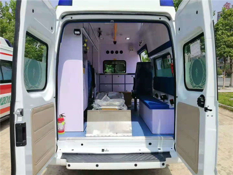 江鈴全順V348監護型救護車醫療艙配置:長排救護警燈1套;自動上車擔架1件,折疊擔架1件,供氧系統:氧氣瓶及氧氣瓶柜、快速接口