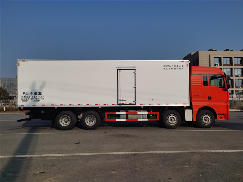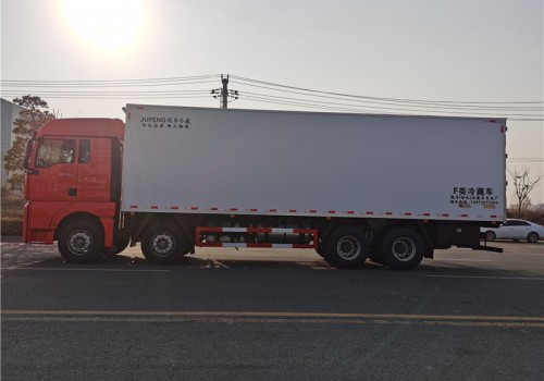 汕德卡自動擋480馬力前四后八9米6冷藏車上裝配置:廂體內尺寸9400x2450X2450(mm):斷橋隔熱工藝、整體結構框架;內外玻璃鋼板夾聚氨酯保溫層真空復合而成,底板為玻璃鋼板,箱體副駕駛邊開側門,地板加裝加厚矩形通風槽,前后封口,龍骨斷橋為松木復合板;木質隔溫結構;廂體厚度為8cm;不銹鋼包角;最新款鋁合金包邊型材;廂體內部安裝2個LED照明燈;后門框為2mm厚不銹鋼材質;門框密封條為橡膠材質;加厚型不銹鋼鉸鏈及鎖件;箱體內部加裝5排肉鉤導軌,地板加裝加厚鋁合金通風槽,200不不銹鋼肉鉤,安裝鄭州凱雪1090非獨立制冷機組。最低溫度可達-18度。