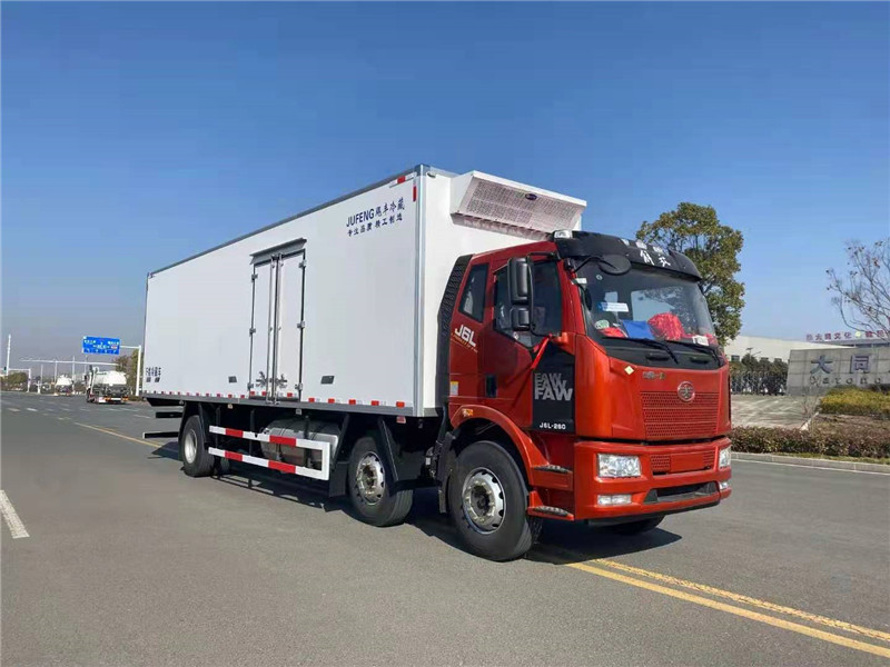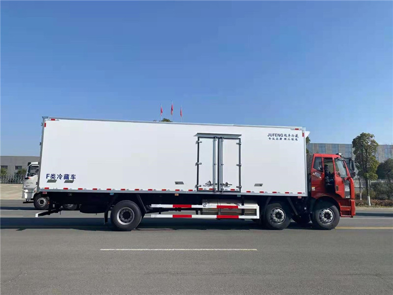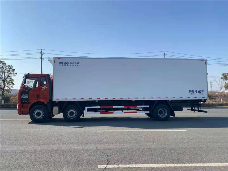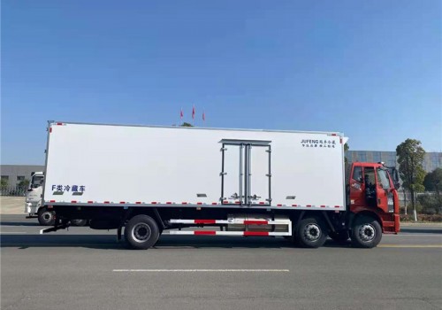 解放天然氣國六9米6冷藏車上裝配置:冷藏箱體內尺寸9600×2420×2450(mm),采用木質工藝(龍骨連接鑲入環保防水木材起保溫耐腐蝕作用)、斷橋隔熱技術!保溫效果達到國家A級標準.箱板是由鍍鋅管骨架加上環保防水木板一次成型,中間8CM保溫板填充、加厚3.0玻璃鋼,高強度粘合劑、熱壓成型,外框采用304不銹鋼、加厚鋁型材包邊、27不銹鋼大門鎖、配件,箱體拼接出來不打膠無縫隙,降溫速度快、散溫慢、保溫效果好,門帶斜邊,副梁是710大梁鋼一次性折成,用壓板鎖緊,側護網和后保險杠一次性成型。