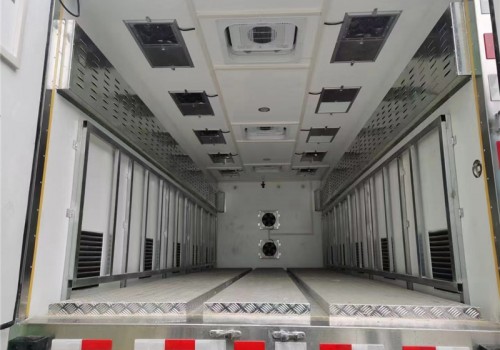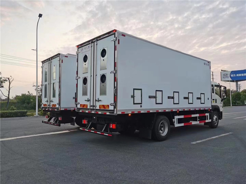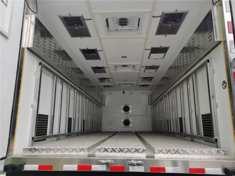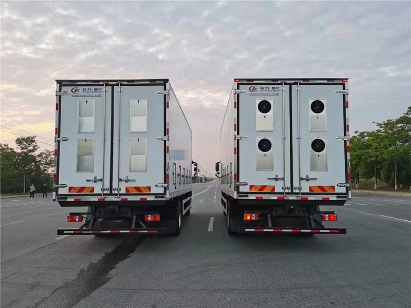 雞苗廂體兩側外部可開啟通風窗口各5個;頂部開開啟排氣天窗3個,天窗兩側各開5個排氣扇,尾門排氣扇4個,廂體內側上部左右兩側配有進風通風道。地板鋁花紋通風道。車廂達到前后左右無死角換氣,保證雞苗高成活率。【翻轉貨架】廂體兩側手動翻轉堆貨貨架;【選裝溫濕度記錄儀】溫度,濕度監測。方便司機觀察箱內溫度和濕度,及時調整運輸狀態,保證雞苗運輸的安全。