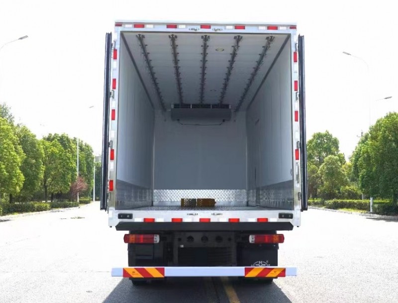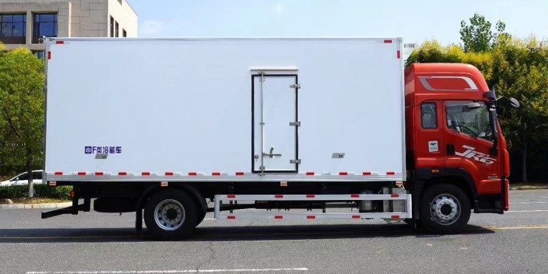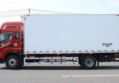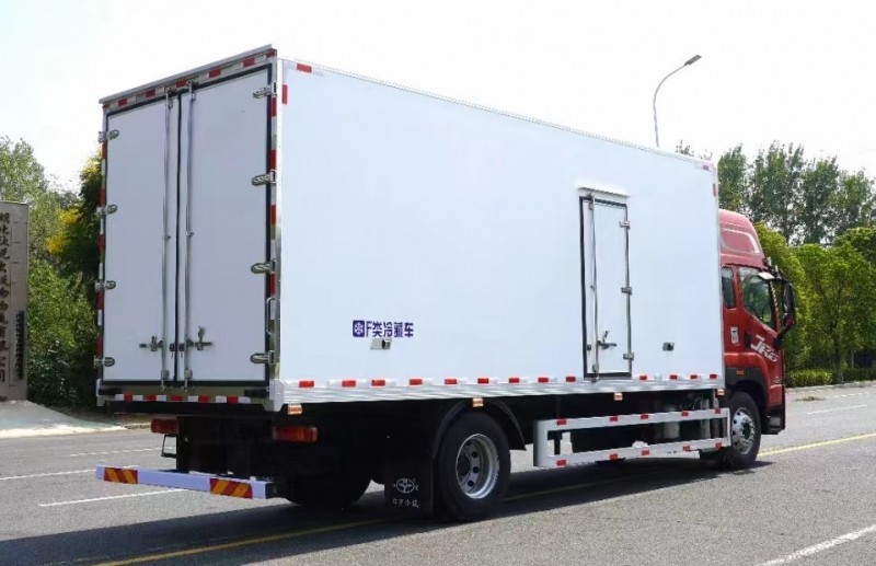解放JK6國六6米8冷藏車上裝配置:箱體內尺寸6750x2440X2500(mm).冷藏廂體外面料為新款啞光加厚玻璃鋼;夾心為高密度保溫材料;全密封雙組合聚氨酯膠粘連/榫卯合廂;整體框架式骨架;廂體保溫板厚度為8cm;鍍鋅包角;鋁合金包邊(鋼制密封鉚釘加固);廂體內部采用LED照明燈及廂體示寬燈;后門框為加厚不銹鋼門飾;密封條為三元乙丙橡膠黑色密封條(新款5葉片帶鋁合金壓條)后門+側門為全包圍密封條;側門框為絕熱PVC+加厚不銹鋼材質;廂體內前端加裝2個排水孔;2個防撞膠塊;1個門把手;副梁整體為輕量化高強鋼;壓板+U型栓+橡膠鋼絲墊皮+護網+擋泥板+3M反光膠板為標準件;
