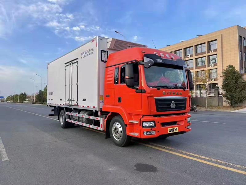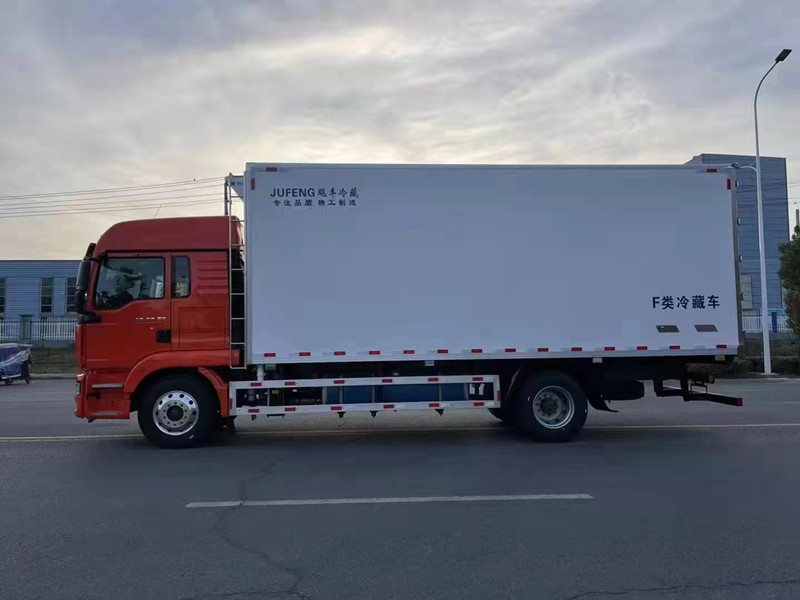 汕德卡國六6米8冷藏車車輛配置:汕德卡C5H高頂雙臥駕駛室,軸距5200mm,MC07.25-60型發動機,重汽曼270馬力,重汽HW95508STCL變速箱(8檔) 中控鎖 ,電動窗 ,電調后視鏡帶加熱, 多媒體影音屏,行駛記錄儀, 原車空調, 斷氣剎,剎車自調大臂, 主氣囊座椅 ,電動前翻駕駛室 ,400L不銹鋼大油箱 ,9噸級后橋 速比4.63 。可調節大燈,剎車自動調整臂。