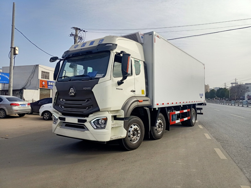 重汽豪沃寬體小三軸9米6冷藏車食品運輸過程中首先需要注意的就是安全,食品的安全、人員的安全、以及車輛的安全。其次食品運輸時,對食品的衛生問題至關重要,特別是一些易腐食品更是如此。成品碼放時,與地面,墻壁應有一定距離,便于通風。要留出通道,便于人員、車輛通行,要設有溫、濕度監測裝置,定期檢查和記錄。運輸作業應避免強烈震蕩、撞擊,輕拿輕放,防止損傷成品外形;且不得與有毒有害物品混裝、混運,作業終了,搬運人員應撤離工作地,防止污染食品。