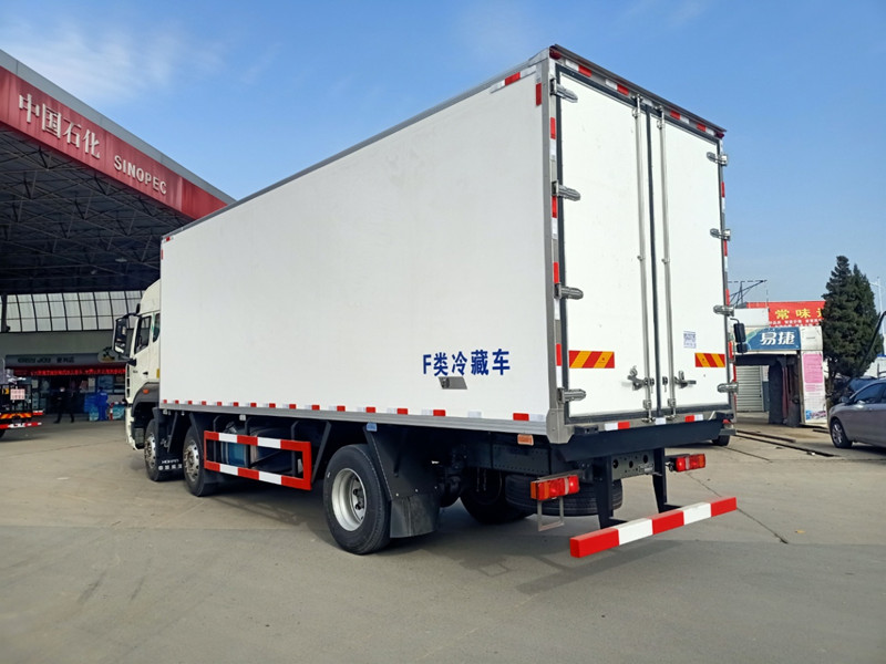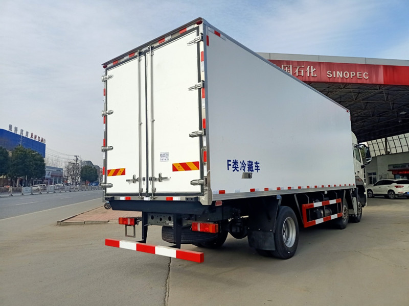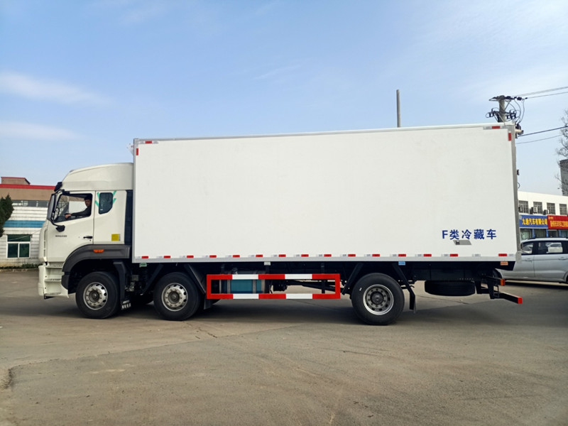 冷藏車箱體是采用國際通用三明治工藝+我廠專利木質工藝(龍骨連接鑲入環保防水木材起保溫耐腐蝕作用)、斷橋隔熱技術,生產線是國際最先進18米大型復合板材生產線,壓板臺面生產前機器自動吸塵干凈,保證壓板機一次壓制成型,其生產設備及技術均領先同行業標準,箱體外形美觀,整體質量輕,強度高,無滲漏特點,箱體堅固耐用,保溫效果高,保溫效果達到國家A級標準。;箱體內部吸選裝下沉式滿焊通風槽,溫濕度記錄儀,肉鉤導軌等專用配置。制冷設備選擇美國開利S850,冷王T880獨立制冷機組,選裝凱雪1080非獨立冷機。制冷溫度最低可達-18度,可根據運輸貨物要求進行調節。