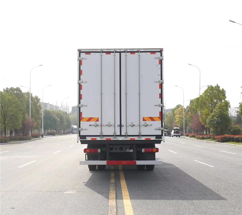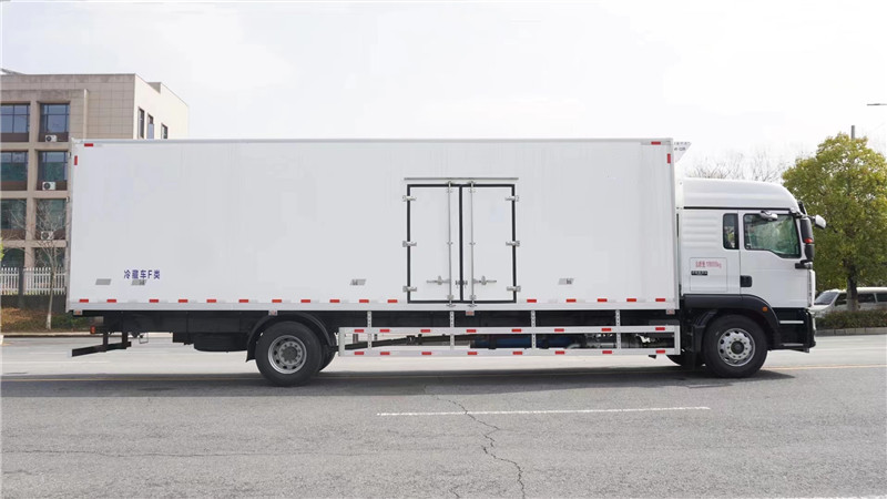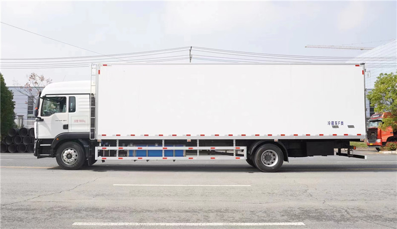 重汽汕德卡G5高頂雙臥大單橋9米6冷藏車專用配置: 冷藏箱體尺寸:9400×2410×2500(mm),《斷橋隔溫工藝、整體結構框架》;內外面料為3mm新款玻璃鋼;側板+頂板:龍骨斷橋為松木復合板;木質隔溫結構;夾心為聚苯乙烯保溫材料;全密封雙組合聚氨酯膠粘連;廂體厚度為8cm;頂板10cm厚,底板12cm厚,鍍鋅包角;最新款鋁合金包邊型材;型材局部厚度為4mm(鋼制鉚釘加固);廂體內部采用2個LED照明燈及廂體示寬燈;后門框為3mm厚不銹鋼材質;門框密封條為三元乙丙橡膠材質;加厚型不銹鋼合頁及鎖件;副梁為Q700車用大梁鋼;15mm厚大梁墊皮;加裝防撞膠塊;不銹鋼門鎖件,配后雙開門。底板為玻璃鋼,單側門。