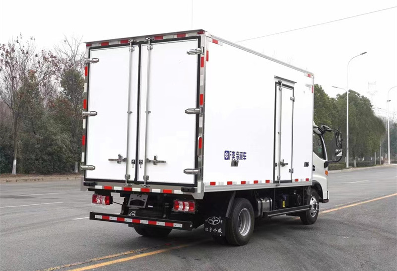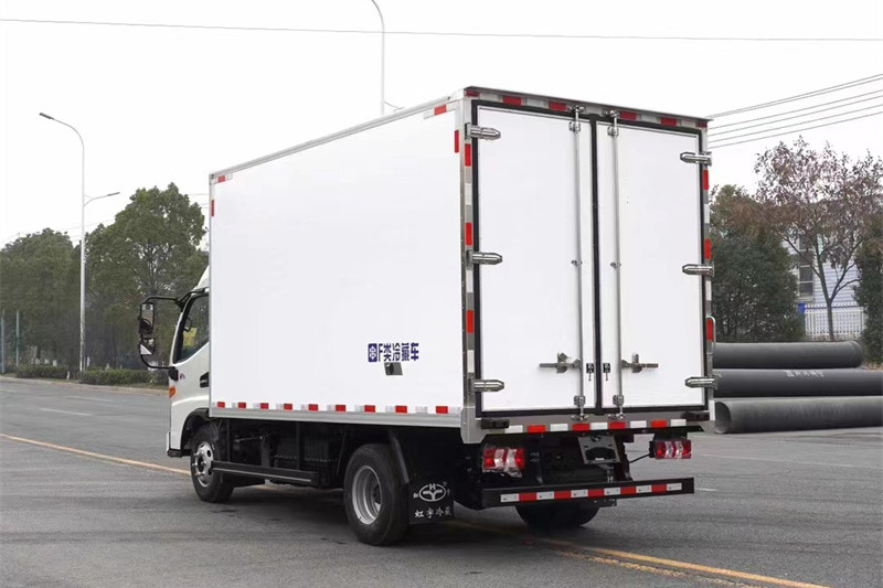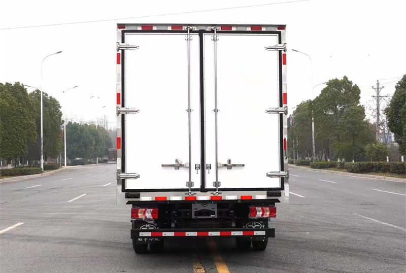江淮駿鈴插電混動綠牌4米2冷藏車上裝配置:保溫箱體內尺寸4030x2100X2100(mm),斷橋隔溫工藝、整體結構框架,內外面料為3mm新款啞光玻璃鋼;側板+頂板:龍骨斷橋為松木復合板;木質隔溫結構;夾心為聚苯乙烯保溫材料;全密封雙組合聚氨酯膠粘連;廂體厚度為8cm;鍍鋅包角;最新款鋁合金包邊型材;廂體內部采用2個LED照明燈及廂體示寬燈;后門框為2mm厚不銹鋼材質;門框密封條為三元乙丙橡膠材質;加厚型不銹鋼合頁及鎖件;15mm厚大梁墊皮;加裝防撞膠塊;不銹鋼門鎖件,帶側門,配后雙開門。