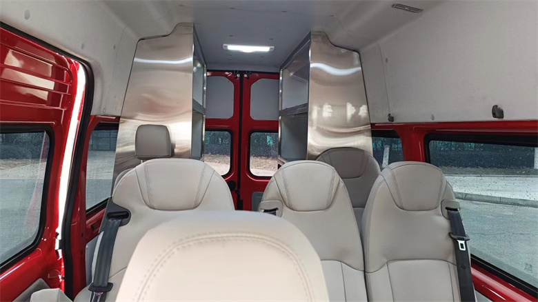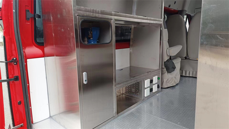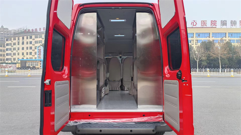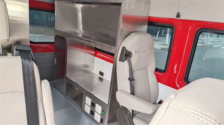 鋁花紋地板防滑、耐磨、易清洗,尾門折疊擔架,供氧系統,10升醫用氧氣瓶2個及專用減震卡箍,固定減壓閥、濕化瓶(瓶閥一體)