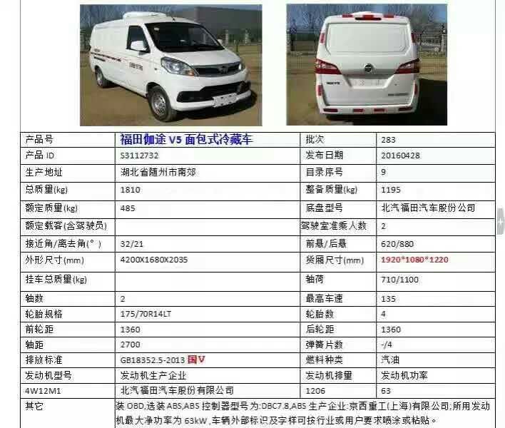 福田伽途V5國五面包冷藏車配置:采用北汽福田國五63KW(85馬力)汽油發(fā)動機,5檔變速箱,油剎,電動玻璃,175真空胎。