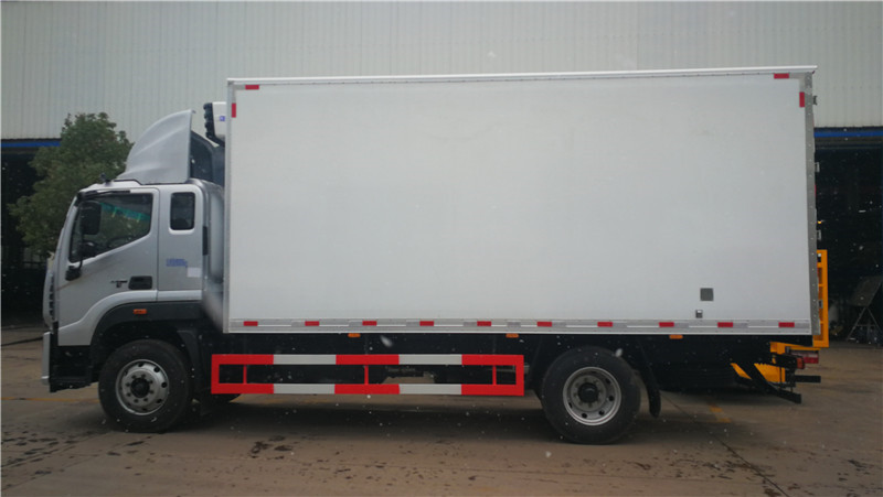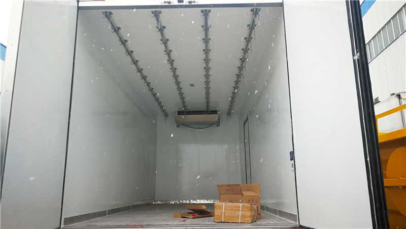 歐馬可S5新款5米9豬白條肉掛冷藏車標準配置:廂體尺寸5900×2450×2500約363立方。內外板材采用冷藏車專用玻璃鋼,(可反射陽光),中間夾層為8CM聚氨酯發泡隔熱材料,(防火阻燃隔熱)真空復合粘接而成,配置箱體全為不銹鋼鎖件,不銹鋼包角,不銹鋼門框,帶有頂燈及防撞塊。廂體底部為鋁花紋板。我廠的冷藏保溫車保溫材料選用進口級別XPS,吸水率≤1,導熱系數≤0.028W/mk,壓≥150Kpa,密度30~45kg/m3,使用國際上最為先進的第五代全封閉聚氨酯板塊粘接結構,廂板表面材料有玻璃鋼、不銹鋼、鋁合金、彩鋼板等材料可供選擇,廂體成型后具有質量輕,保溫系數高,抗沖擊力強,無滲漏等優點,對大氣、水和酸、堿、鹽等介質具有良好的耐腐蝕性和抗老化性 。通過優化設計,降低了整車質心,增大了有效容積。經測試,整車綜合節能率,使用壽命,比一般冷藏廂保溫高1~2倍。廂體加裝4排肉鉤導軌。