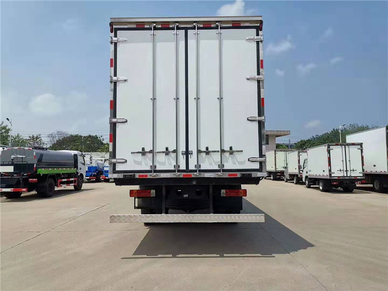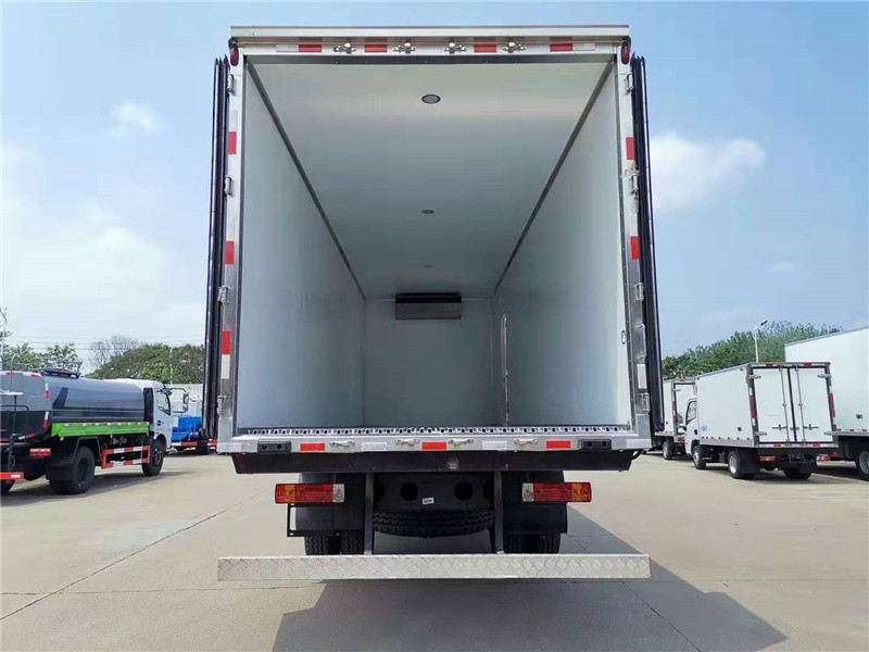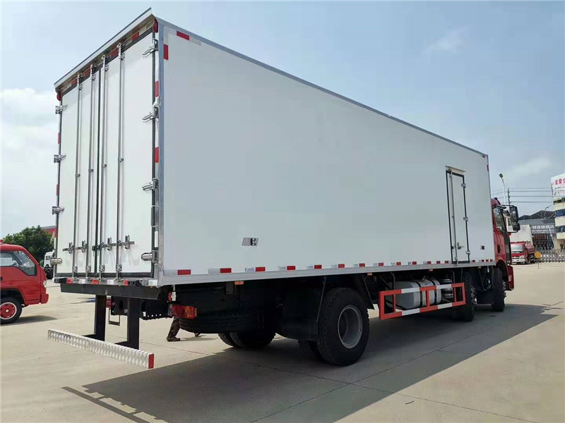 解放J6L前四后四8米6冷藏車標準配置:冷藏廂體內尺寸8700X2410X2500(mm)計42立方,冷藏廂體內外板材采用冷藏車專用玻璃鋼,(可反射陽光),中間夾層為8CM聚氨酯發泡隔熱材料,(防火阻燃隔熱),,廂體全部采用斷橋隔熱工藝,木板包覆鍍鋅管整體木質框架,箱板采用真空床加熱負壓一次性成型的三明治結構,內外為2.0厚度玻璃鋼,中間為8MM保溫板,不起泡、平整度高。廂體箱板之間涂抹加強結構膠,采用加長螺栓連接,不漏氣不漏水,牢固性,保溫性大大能優于同類產品。廂體內部可選裝運輸冷鮮肉所需的肉鉤導軌,地板選裝鋁合金通風槽,選裝單側門,雙側門,選裝溫濕度記錄儀等設備,安裝美國冷王T-800M(50)獨立制冷機(帶備電加熱),最低制冷溫度可達-18度。