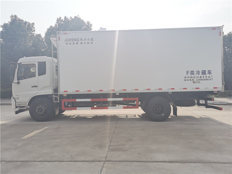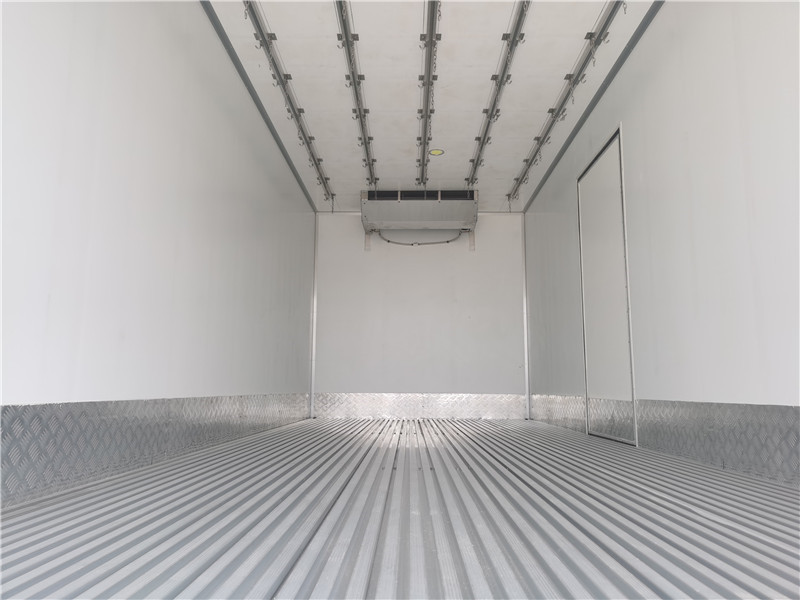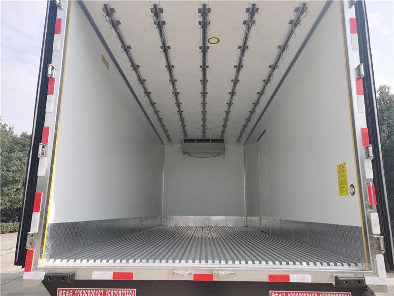 3、颶豐冷藏車廠生產線是國際最先進18米大型復合板材生產線,壓板臺面生產前機器自動吸塵干凈,保證壓板機一次壓制成型,其生產設備及技術均領先同行業標準,箱體外形美觀,整體質量輕,強度高,無滲漏特點,箱體堅固耐用,保溫效果高,保證不鼓包。箱體頂部加裝5排肉鉤導軌,地板加裝 加厚通風槽,可走小叉車。